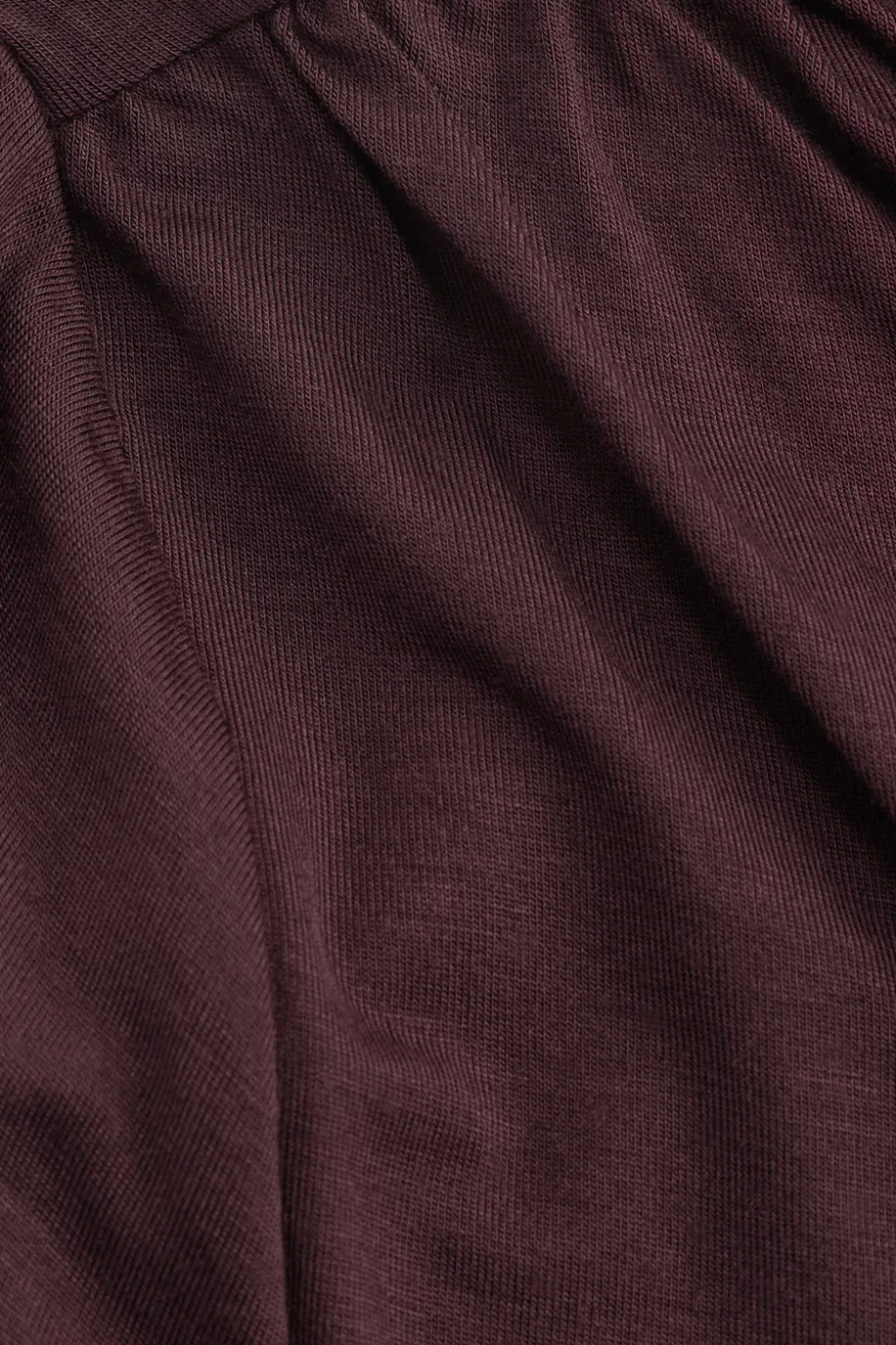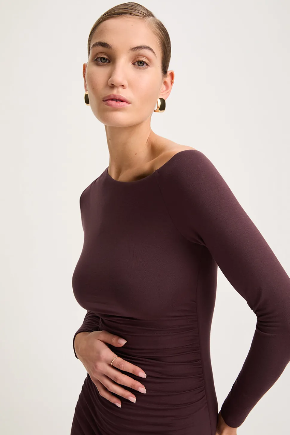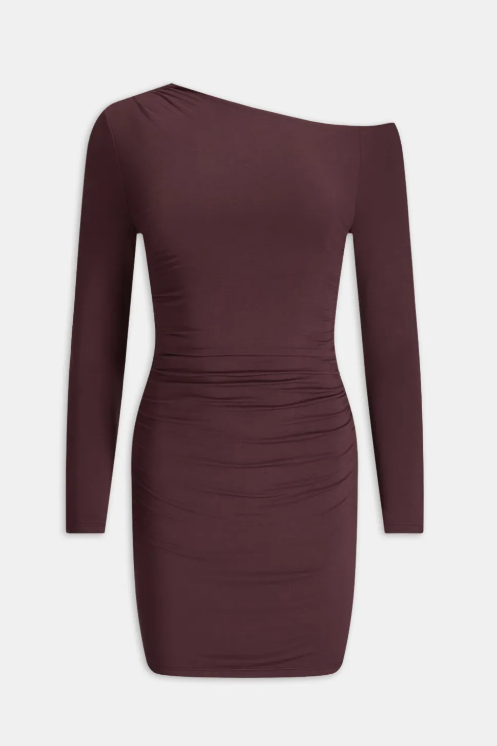 365 Asymmetric Ruched Side Long Sleeve Mini Dress – Mulled Wine