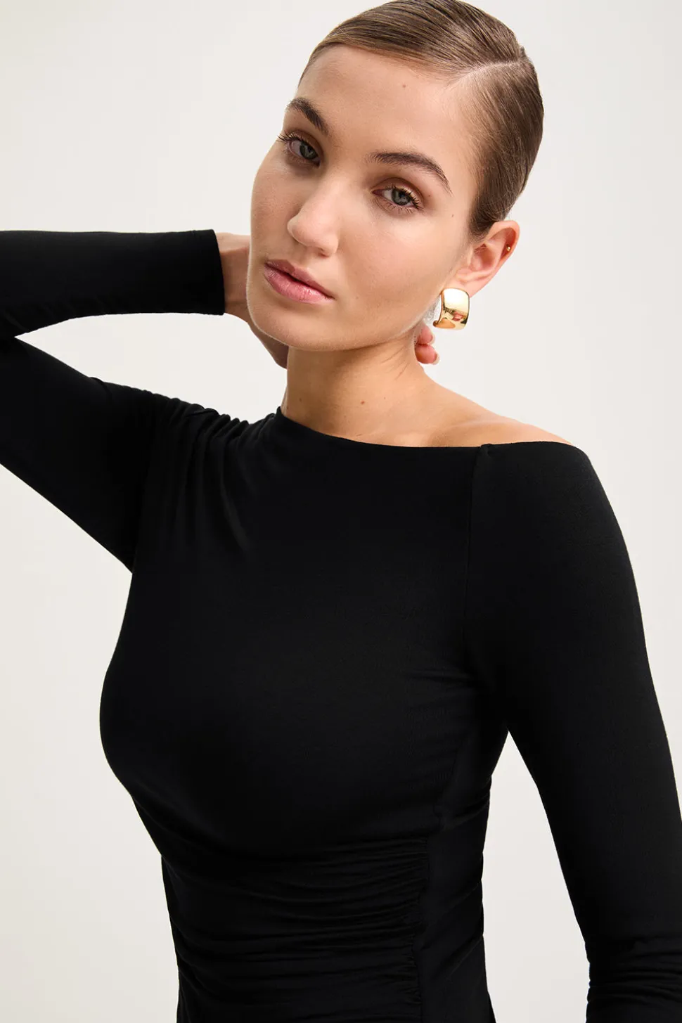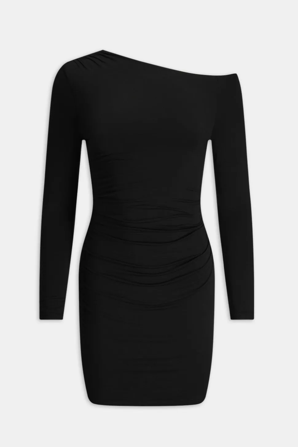 This is the ultimate “dressy” dress. Perfect for all the parties you’ve said “yes” to and every invite to come, who needs sequins when you’re blessed with a sparkling personality? Made from our viral 365 Original material that is oh-so-soft and double-layered, you can wear this mini dress comfortably and confidently — no bra, no problem. Ruched for added drama with an asymmetric neckline and long sleeves that could convince you to leave your coat at home if you’re brave (and have an Uber booked).