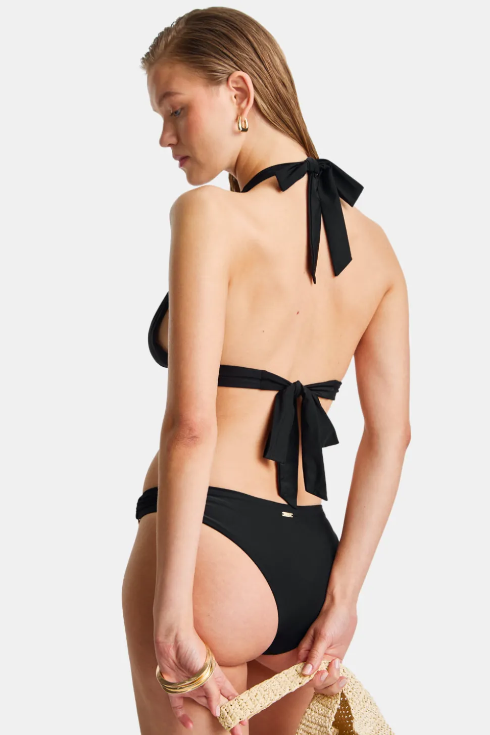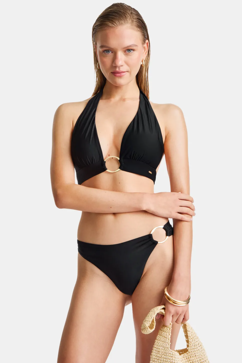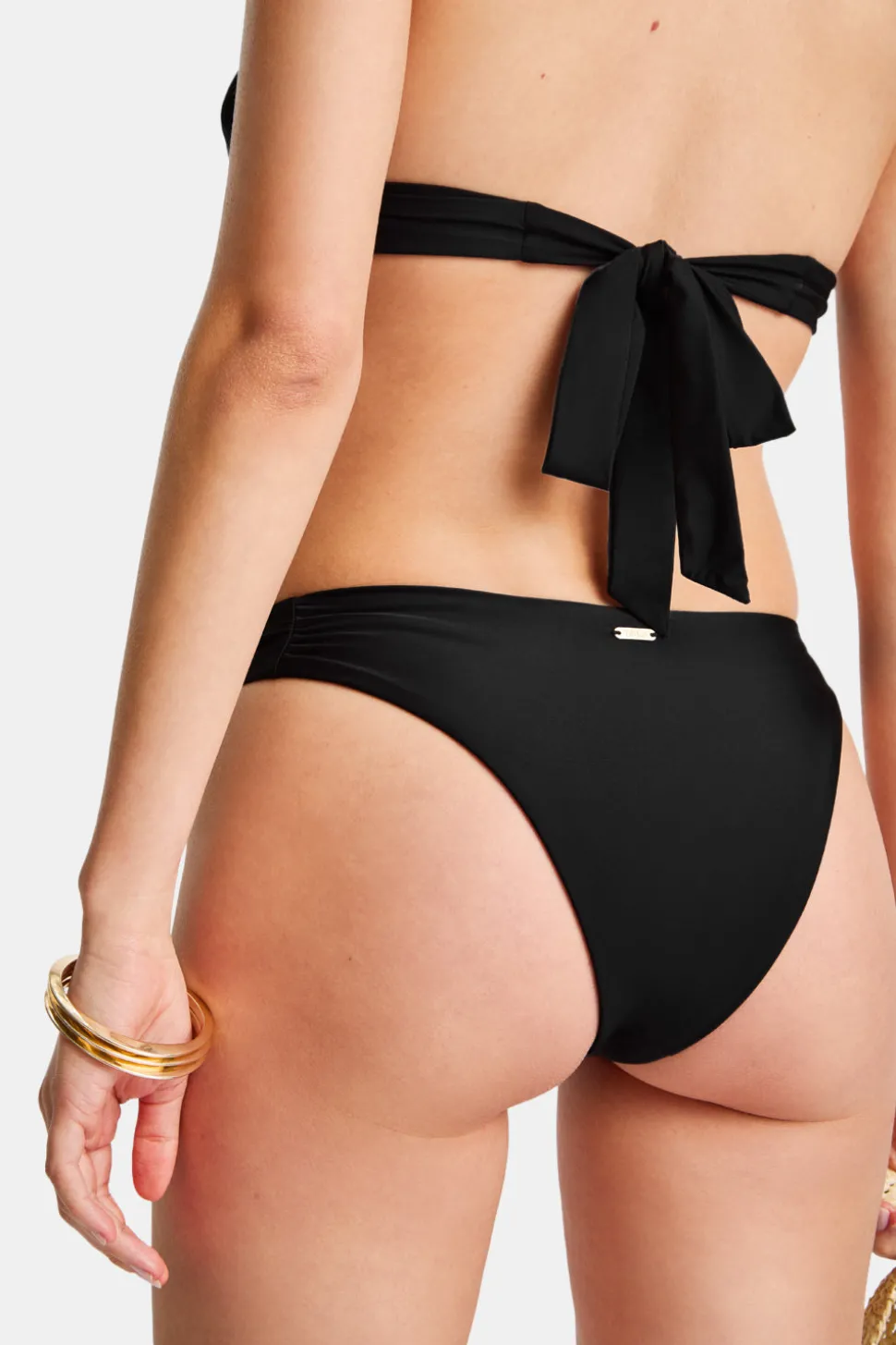 Legs for (sun)days thanks to an ultra high cut. Created with all-day glow in mind, our luxe sheen fabric and gold hardware reflect the sun wherever you go. Pair with the matching Halter Plunge Bikini Top.