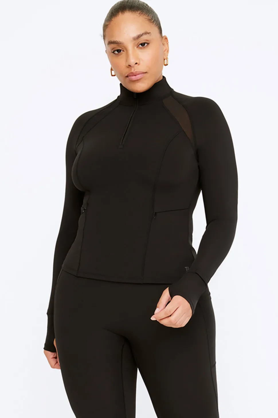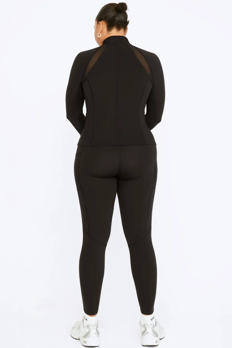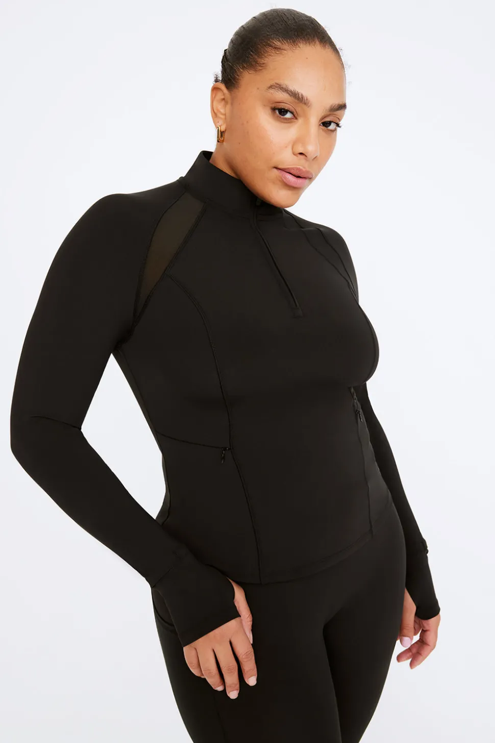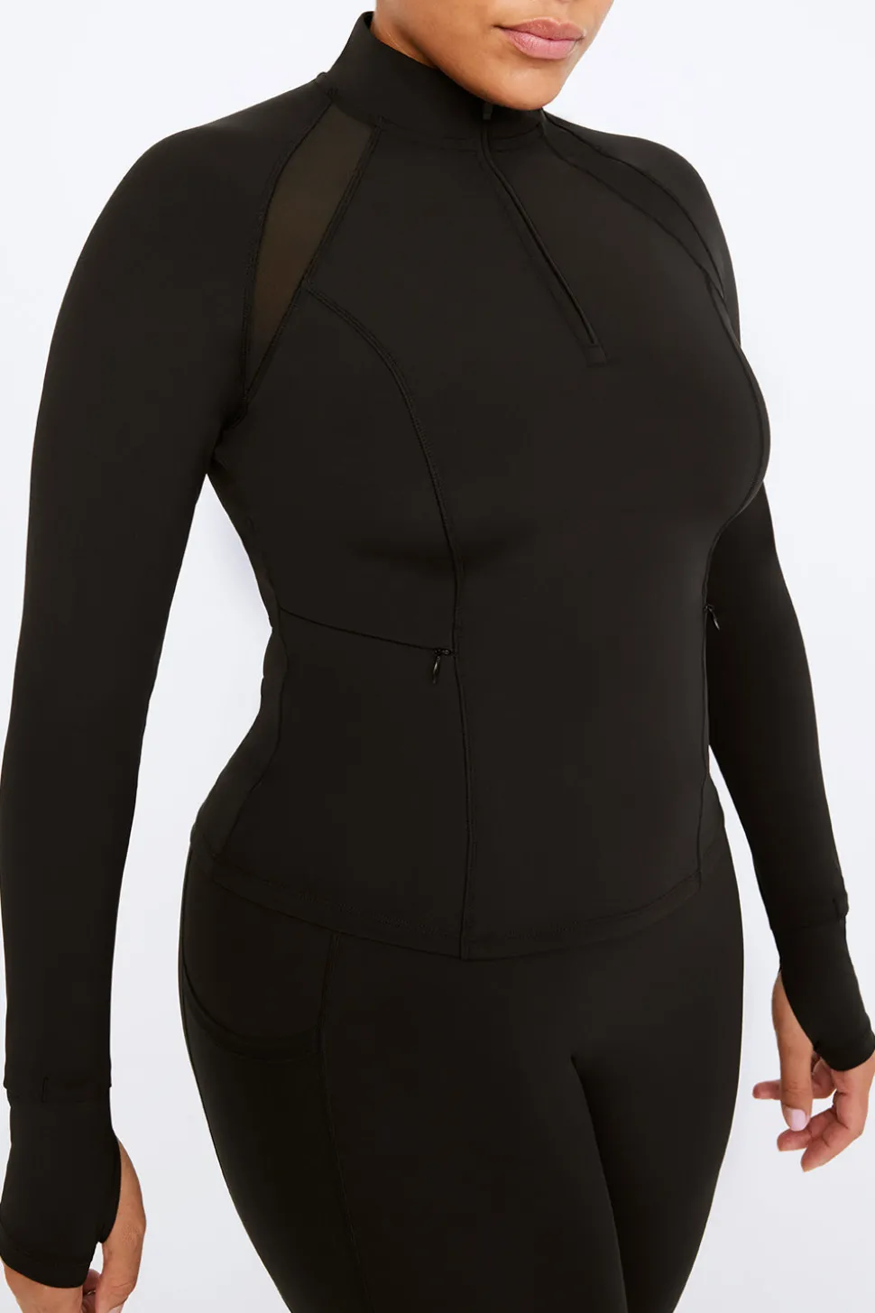 Carefully crafted to be ultra lightweight with a four-way stretch to give you freedom of movement and enhance your performance, it is also fitted with breathable raglan mesh detailing for both looks and function. We’ve thought about every detail: a watch opening on each wrist, thumbholes, a mock neck and two full-sized vertical pockets.