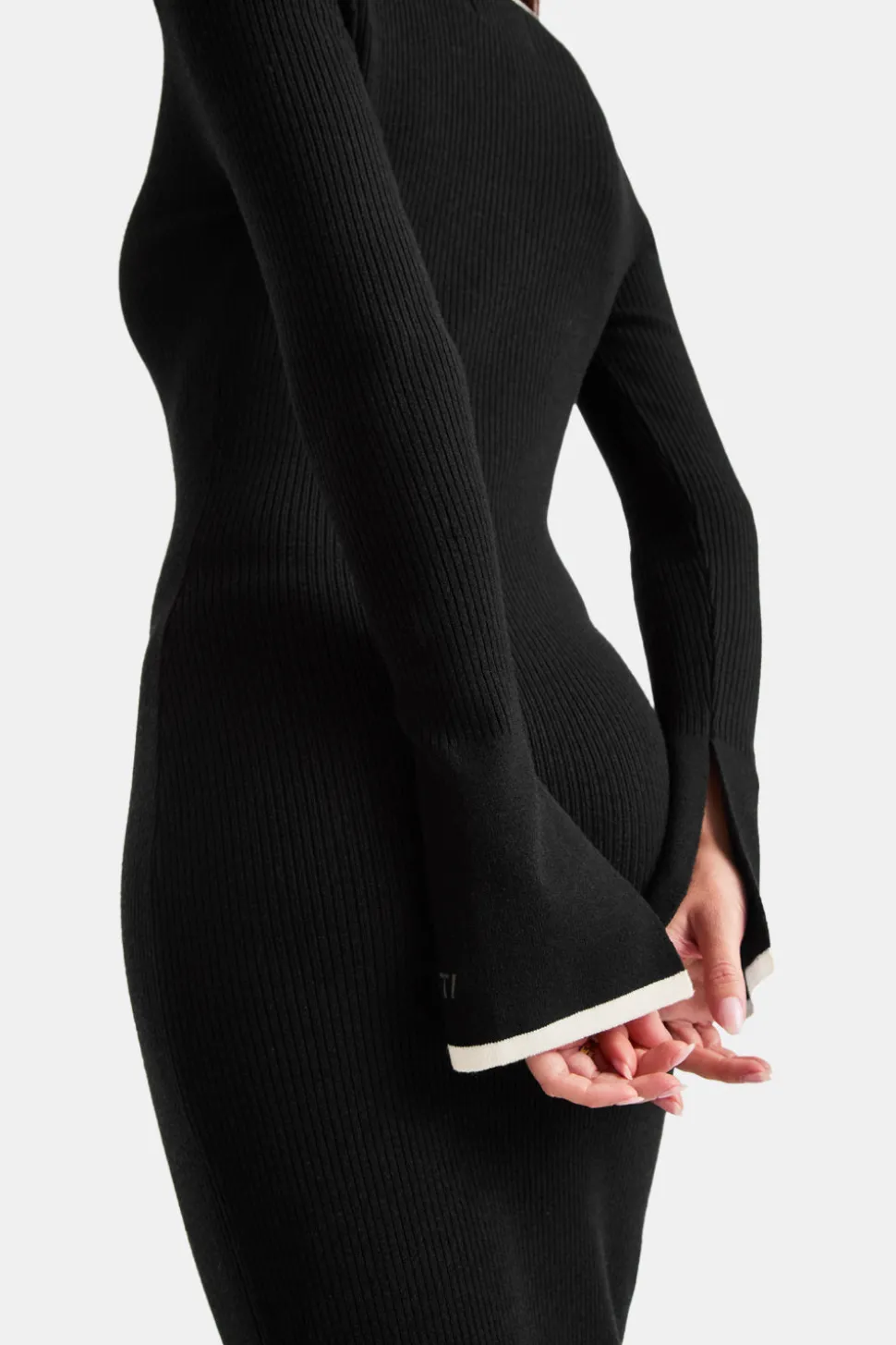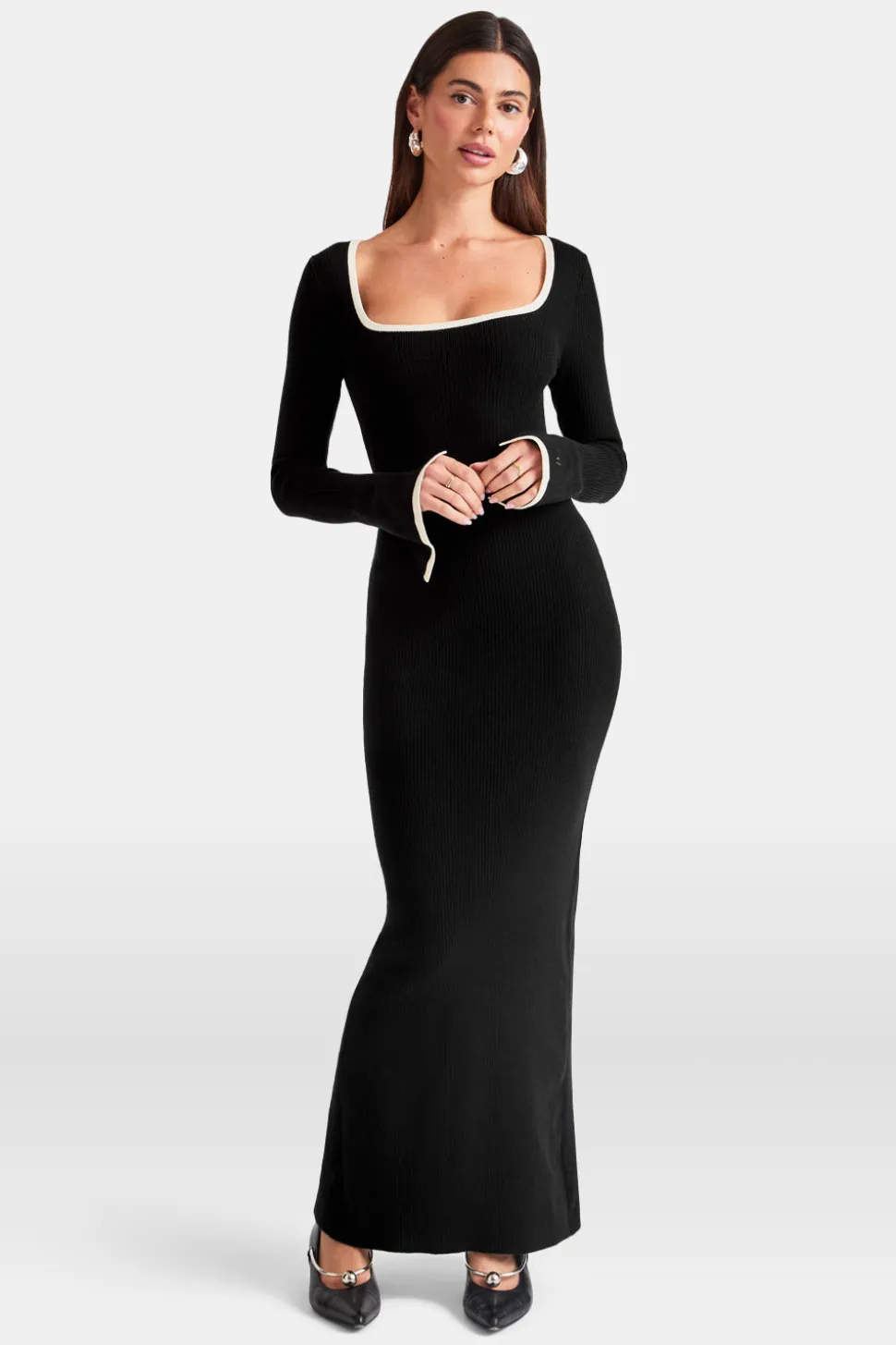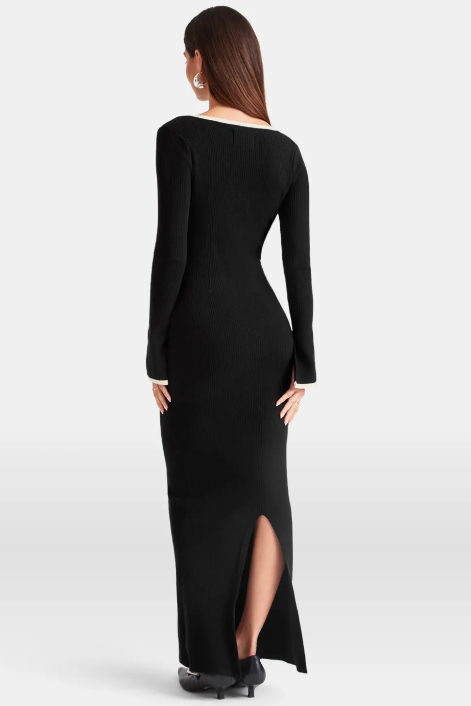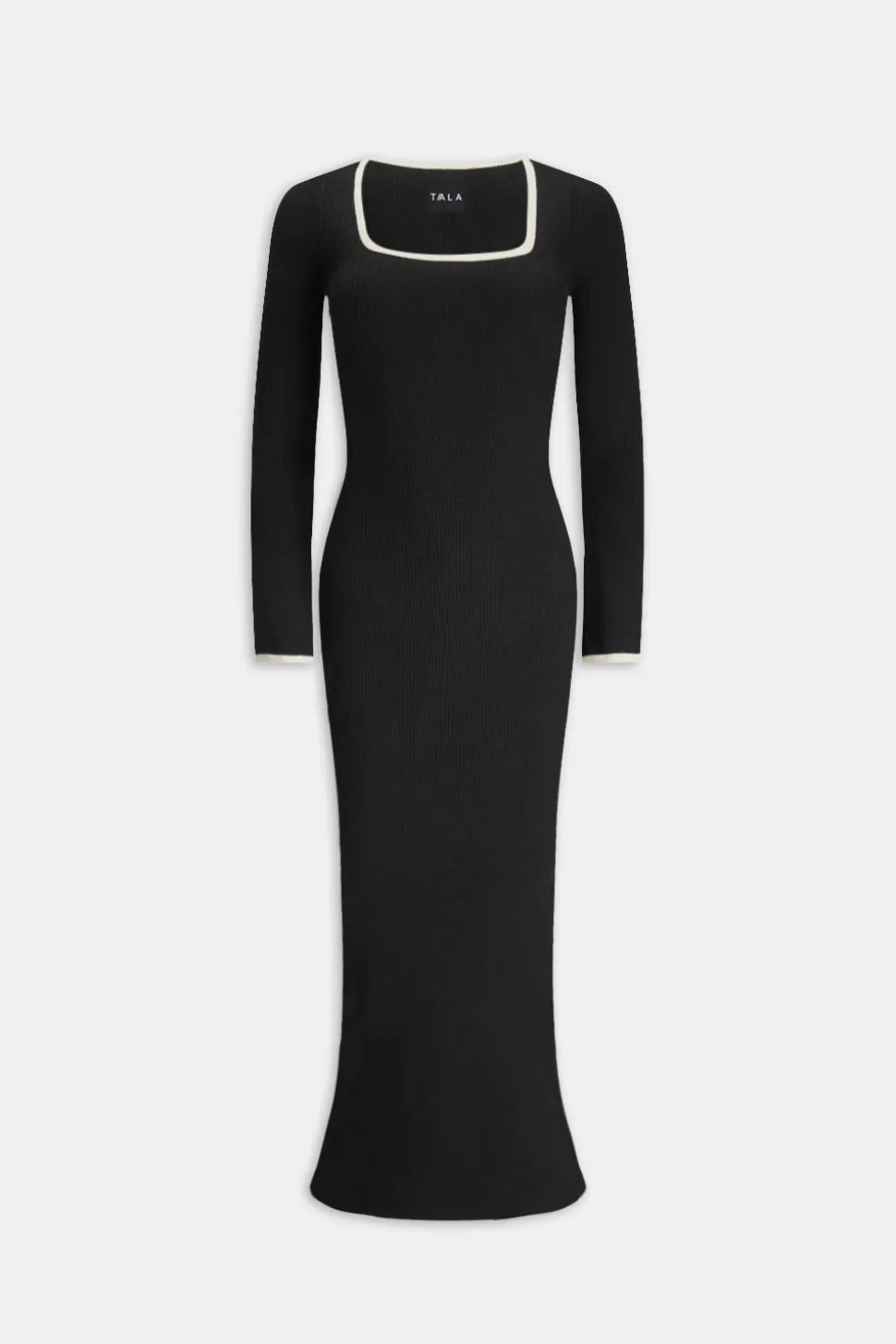 Introducing the cosiest way to cocktail hour: our long sleeve contrast ribbed knit maxi dress. Featuring a softly squared neckline that begs for a necklace stack, contrast edge detailing and a tonal embroidered TALA logo on the back, why stress over your outfit when you can drink a mojito solo before your guests arrive instead? She looks deceptively simple but we’ve added subtle design details like the lightly flared sleeves with a cuff split for understated drama.