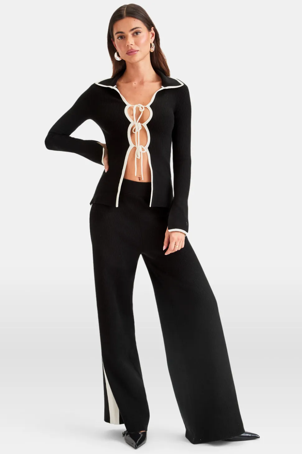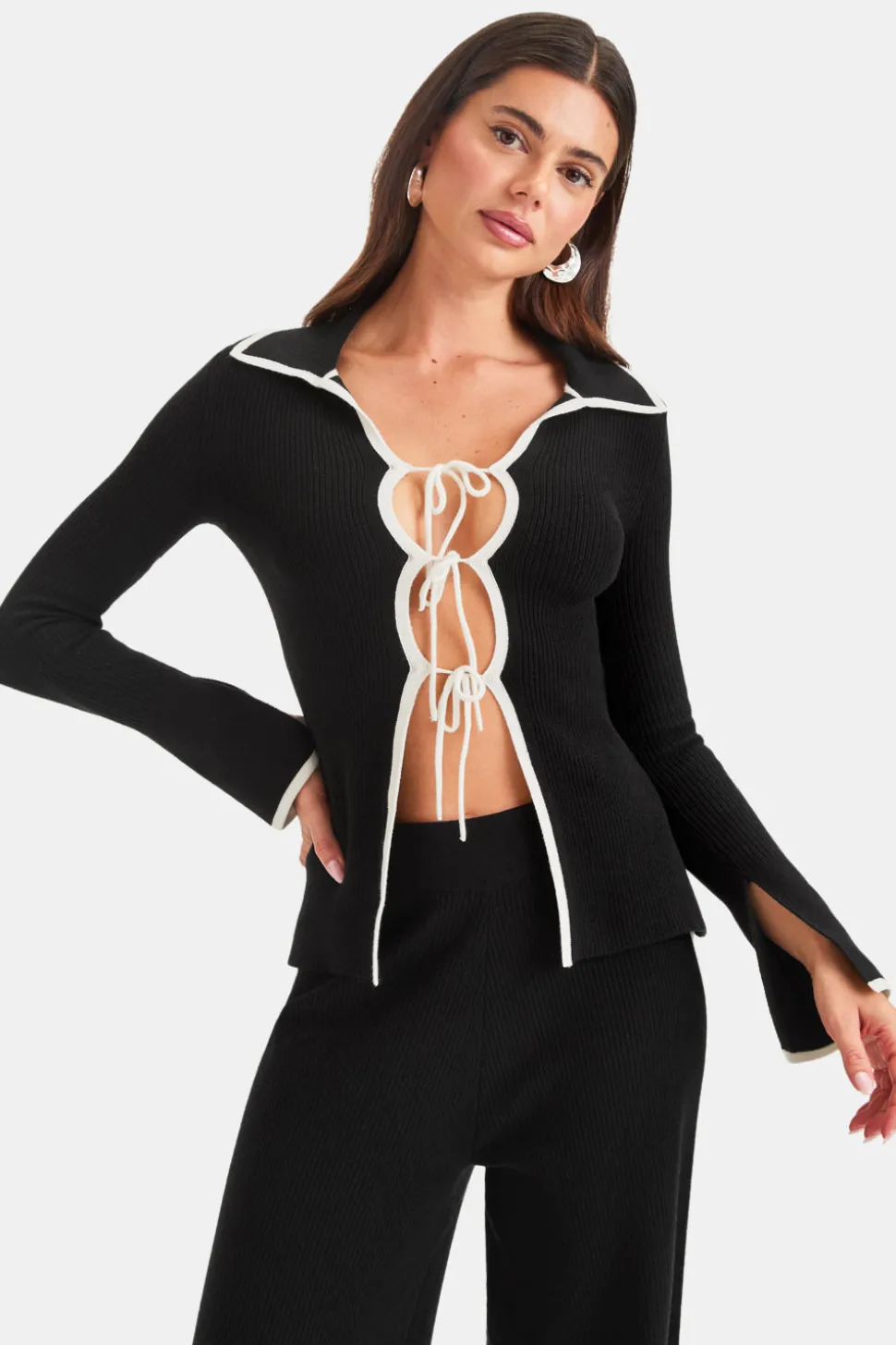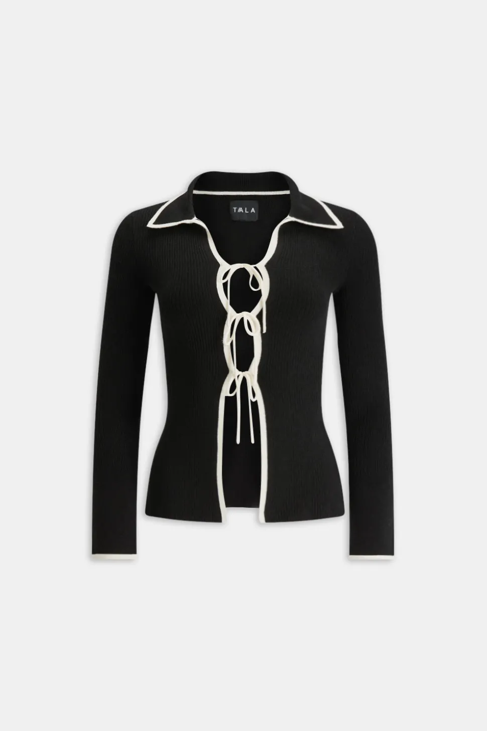 Not quite a cardigan, not quite a top, this form-fitting long-sleeve beauty is in a league of her own. Featuring a collared design with lightly flared sleeves and a split on the inside cuff, we designed this knit with a self tie front which (if we do say so ourselves) makes the girls look the best they ever have – in knitwear, at least. The contrast edge detailing and tonal embroidered TALA logo at the back take her from just nice to (kn)it girl worthy.