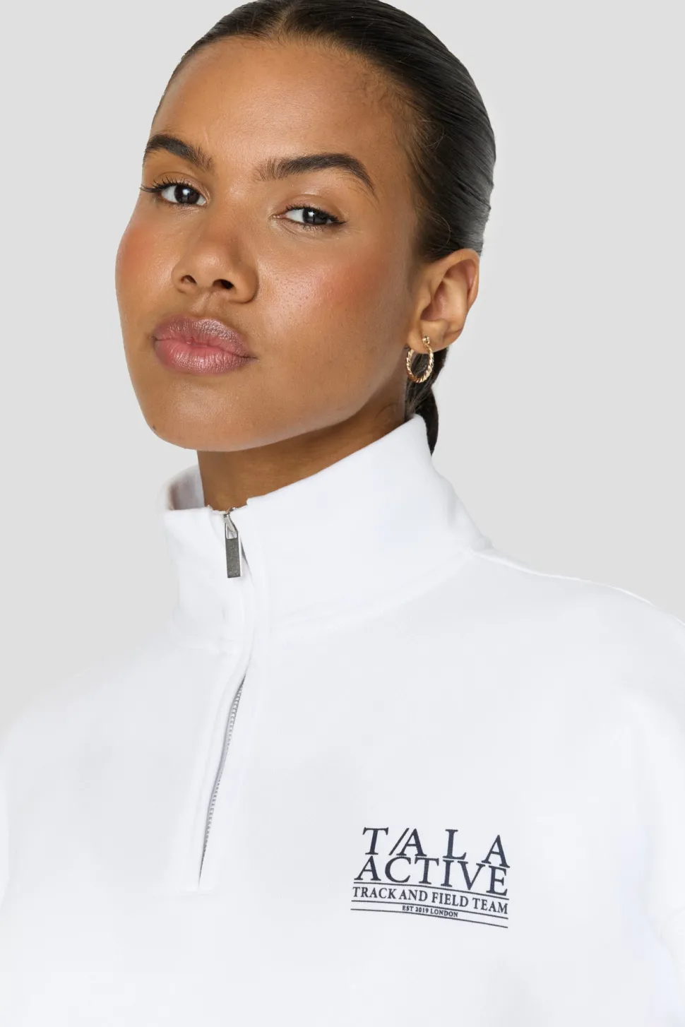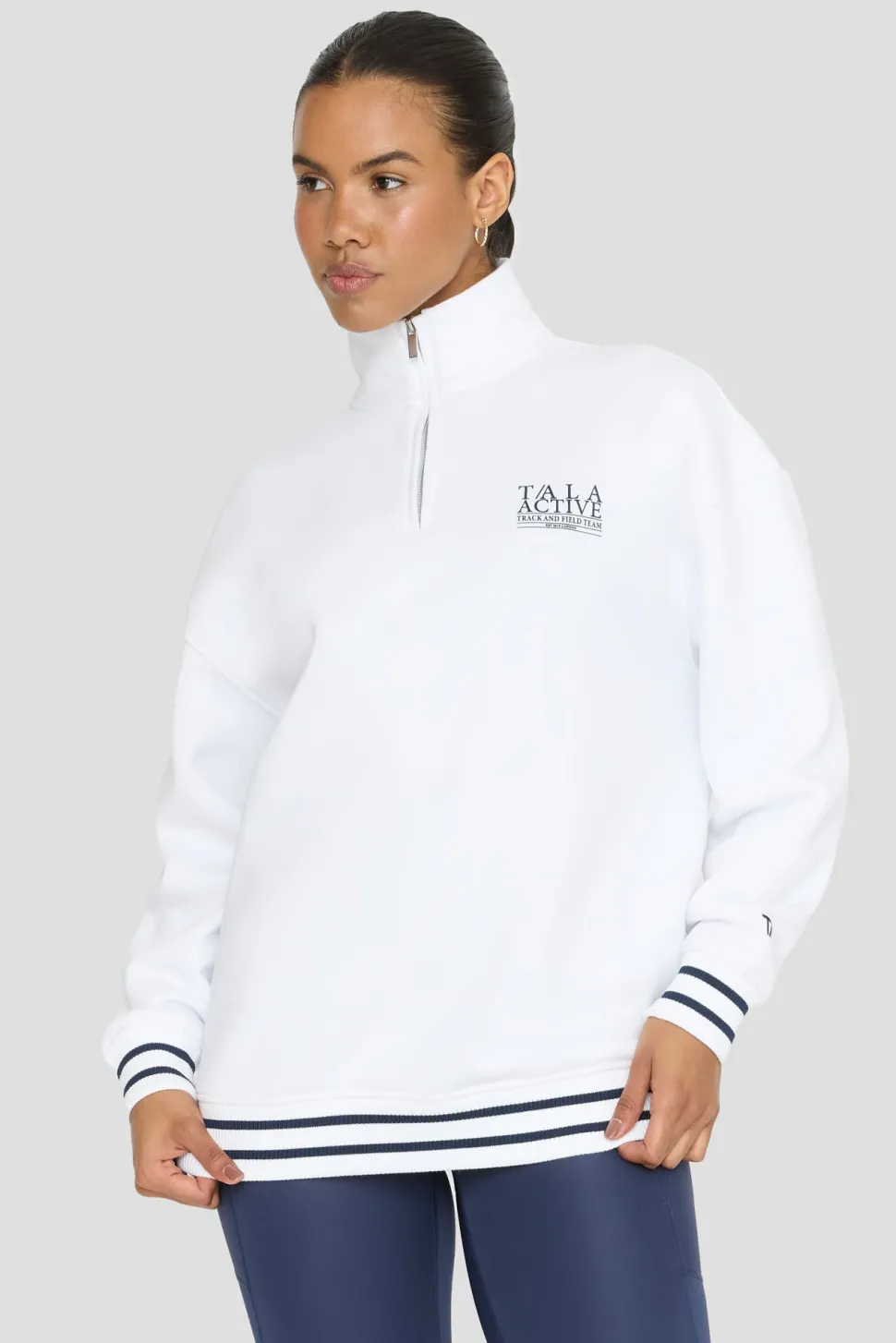 Welcome to the TALA Track and Field Club. If we had a sports team strip, this would be a staple piece of our home kit. This oversized, longline, slouchy sweat has all the super soft, fleece-back fabric features you know and love. Finished with a contrast ribbed cuff and hem, quarter zip and varsity logo graphic, there’s no other team you’ll want to support this summer.
