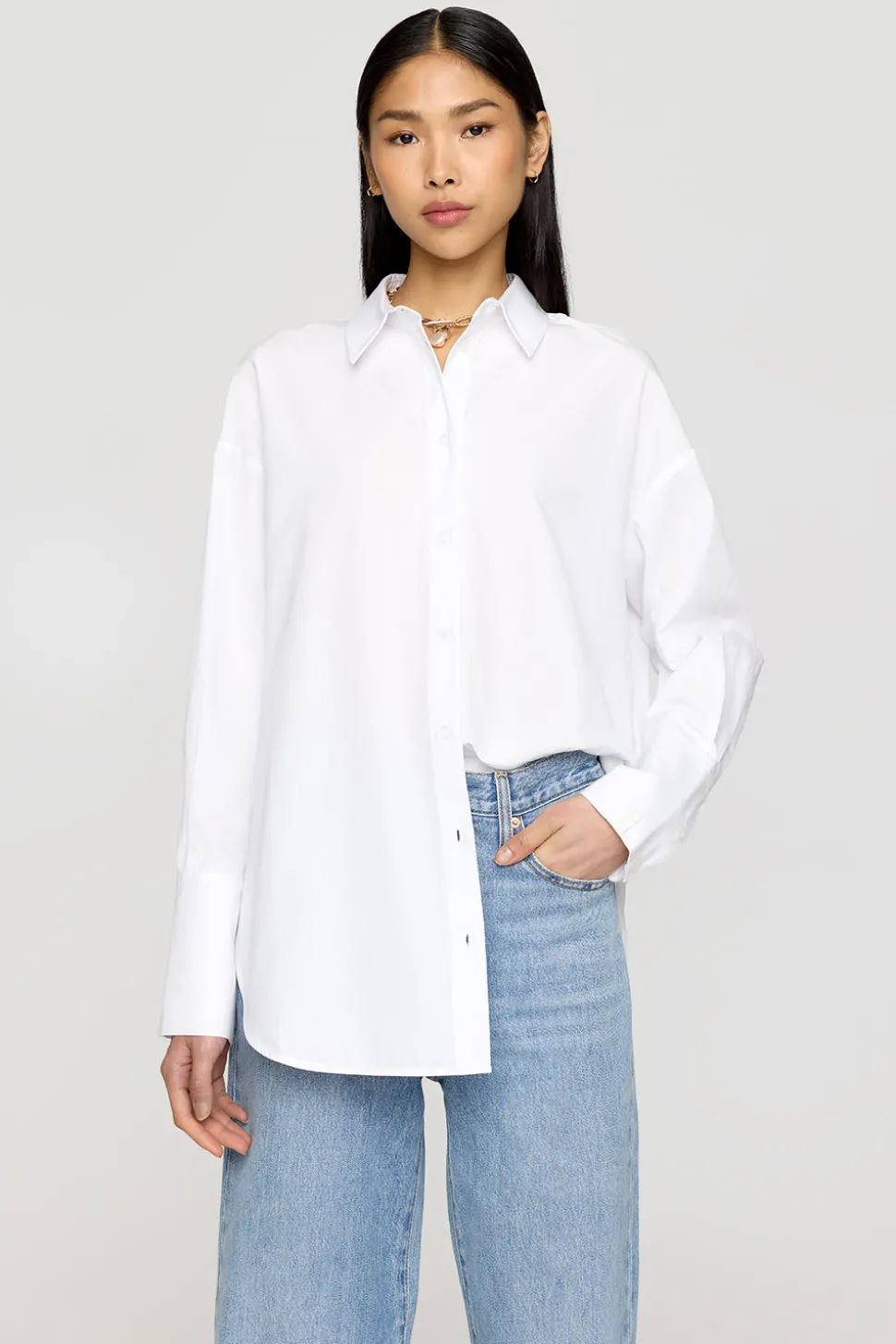 To the untrained eye, this could look like a standard white shirt, but au contraire: this has actually been designed from scratch to be THE perfect oversized white shirt for year-round styling. Deep cuffs allow you to choose your sleeve length; side splits on each side allow for half-in-half-out styling that always looks good. And if that wasn’t enough, the classic curved and bonded hem, oversized (but still flattering) fit and 100% organic cotton material allow you to wear and style this shirt 365 days a year.